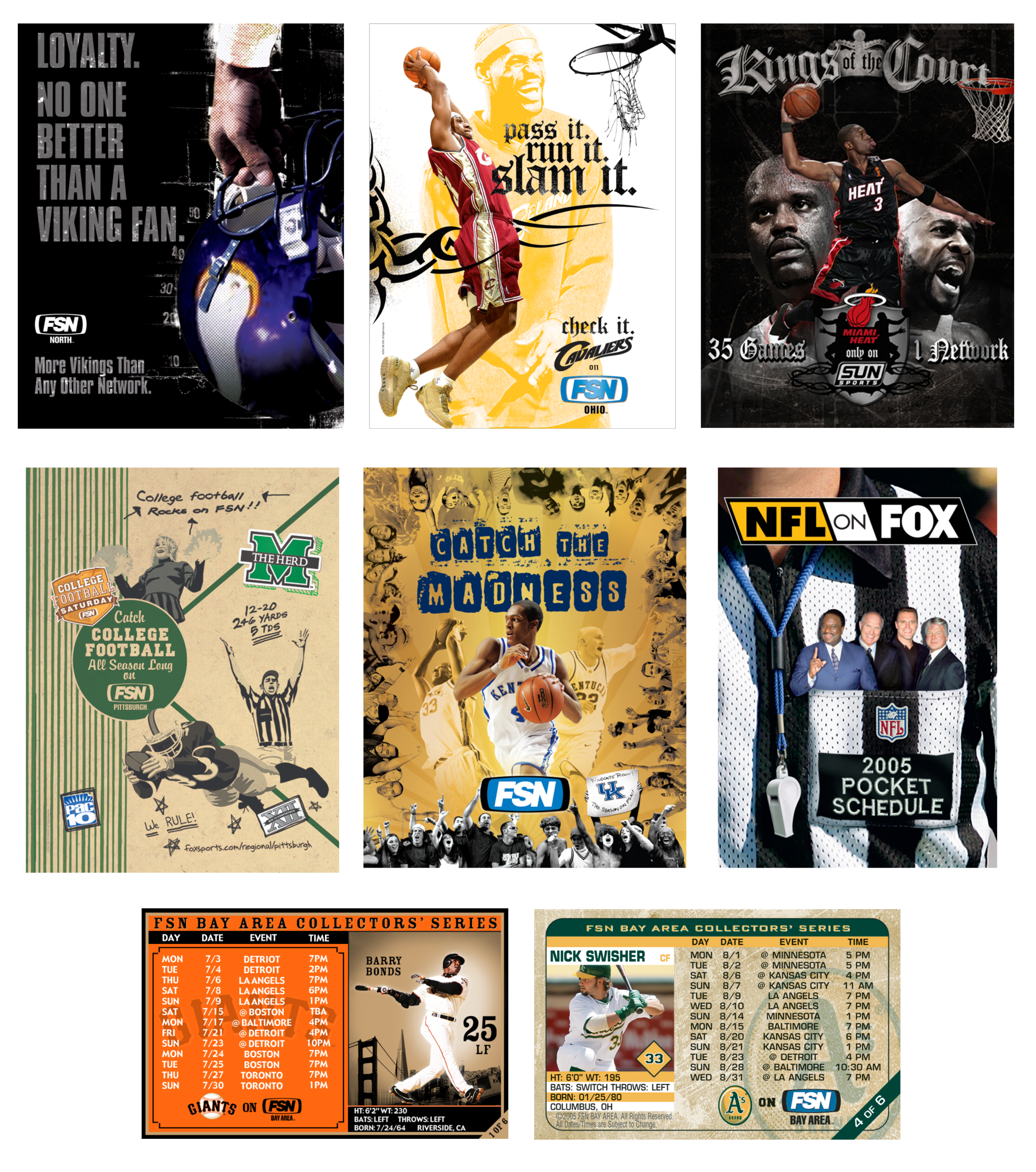 I conceptualized and designed print and interactive projects for FoxSports and FSN which included print ads, interactive banners, web email and layout, signage, logo development, posters, outdoor billboards/transportation and new season looks for all major (MLB, NBA, NFL, Nascar, NHL, and NCAA) and ancillary sports.